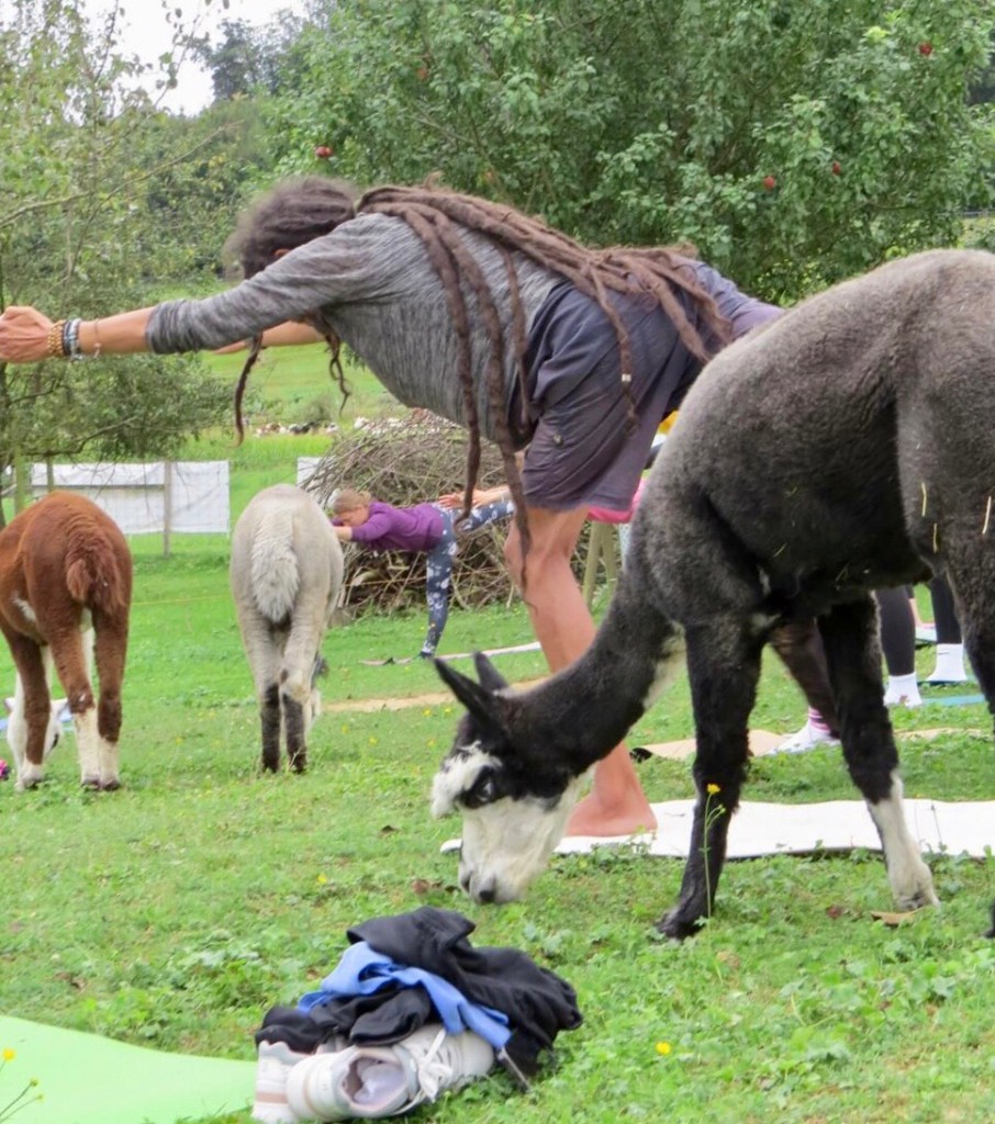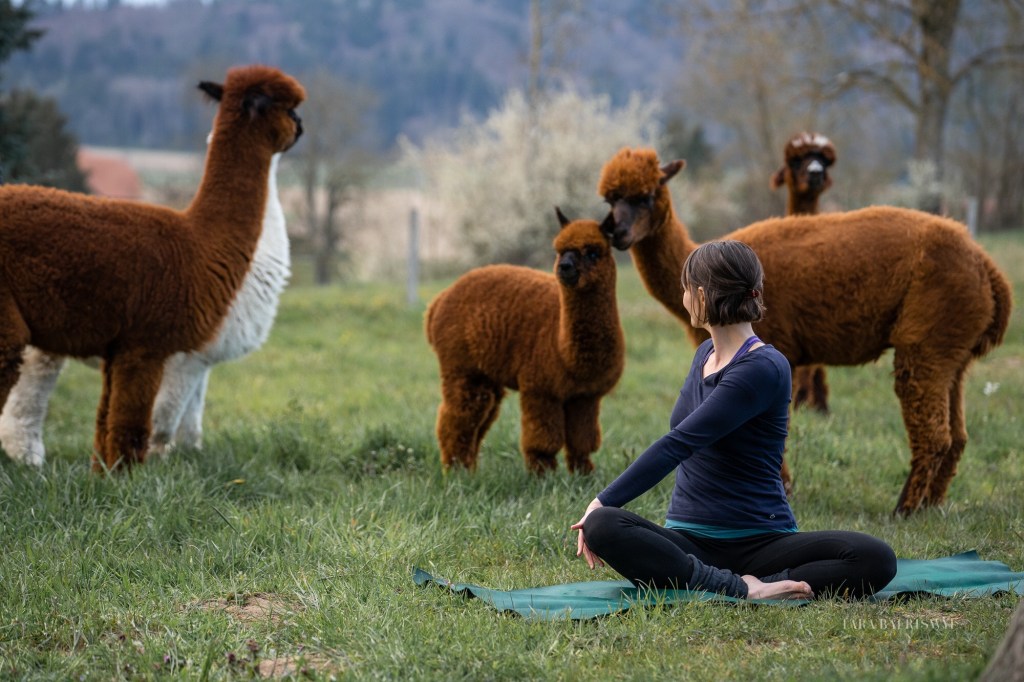 auf Deiner Matte inmitten der Alpaka-Weide mit viel frischer Luft kannst Du auf besondere Weise entspannen & auf neue Gedanken kommen